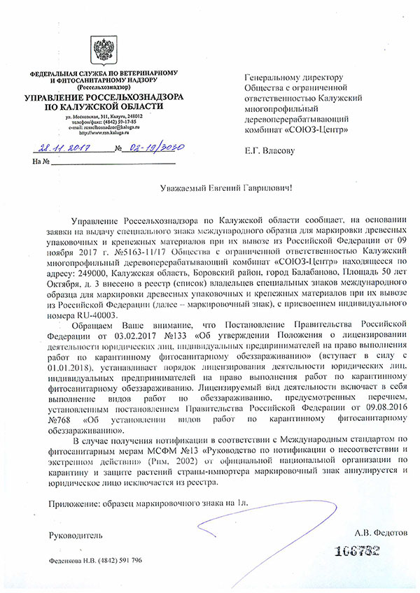 После успешного прохождения процесса лицензирования, на основании заявления на выдачу специального знака международного образца для маркировки древесных упаковочных и кремежных материалов при их вывозе из РФ огранизация вноситься в реестр владельцев специальных знаков с присвоением индивидуального номера. Так же составляется акт проверки соответствия условий и технологии фумигационной обработки установленным нормам и правилам.